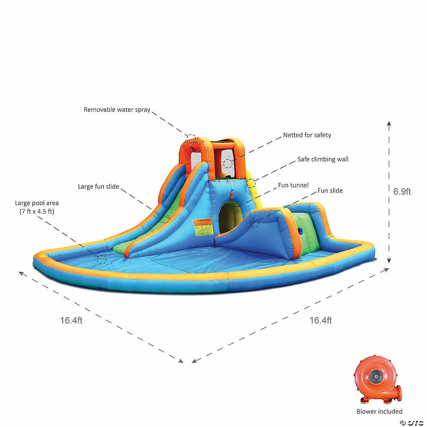 The Cascade Water Slides inflatable is the ultimate summer getaway for all ages! With two slides (the larger one 7 feet long and 4.5 feet high and the smaller one 3.5 feet long and 2.5 feet high.), a large splash pool of 7.9″ – 9″, and a fun tunnel, your kid will enjoy every moment of their summer vacation!Features & Specifications:16.5 ft L x 16.5 ft W x 7 ft H inflated sizePowered by strong UL blower (included)Heavy-duty puncture proof material with double to quadruple stitchesStrong 9″ stakes to secure the water slide to the groundLong fill tube (approx. 6 ft) allows blower to be placed away from the water slide while inflatingEasy set up and take downInflates in less than a minuteOutdoor UseShipping weight: 55 lbsPackage size: 28″ x 17″ x18″Weight Limit Recommendations:Recommended for ages 3 and upMaximum kids on each slide: 1Maximum kids in the pool play area: No limitMaximum individual weight: 100 lbsMaximum individual height: 5 ftPackage Includes:16.5 ft L x 16.5 ft W x 7 ft H Water Park0.8HP, 5A Blower UL certified electric blower with 25 ft power cord and GFCI plug (Recommended for all electronic toys by the American Consumer Safety Committee)Hose assembly with spray nozzleGround stakes packLarge carrying bagRepair kit and instructionsSpecial Shipping Information: This item ships separately from other items in your order. This item cannot ship to a P.O. Box. This item may be subject to additional processing days. ITEM IS NOT ELIGIBLE FOR EXPEDITED SHIPPING You may initiate a return for unused items within 30 days, if the items are in original packaging with all original materials included with the shipment.