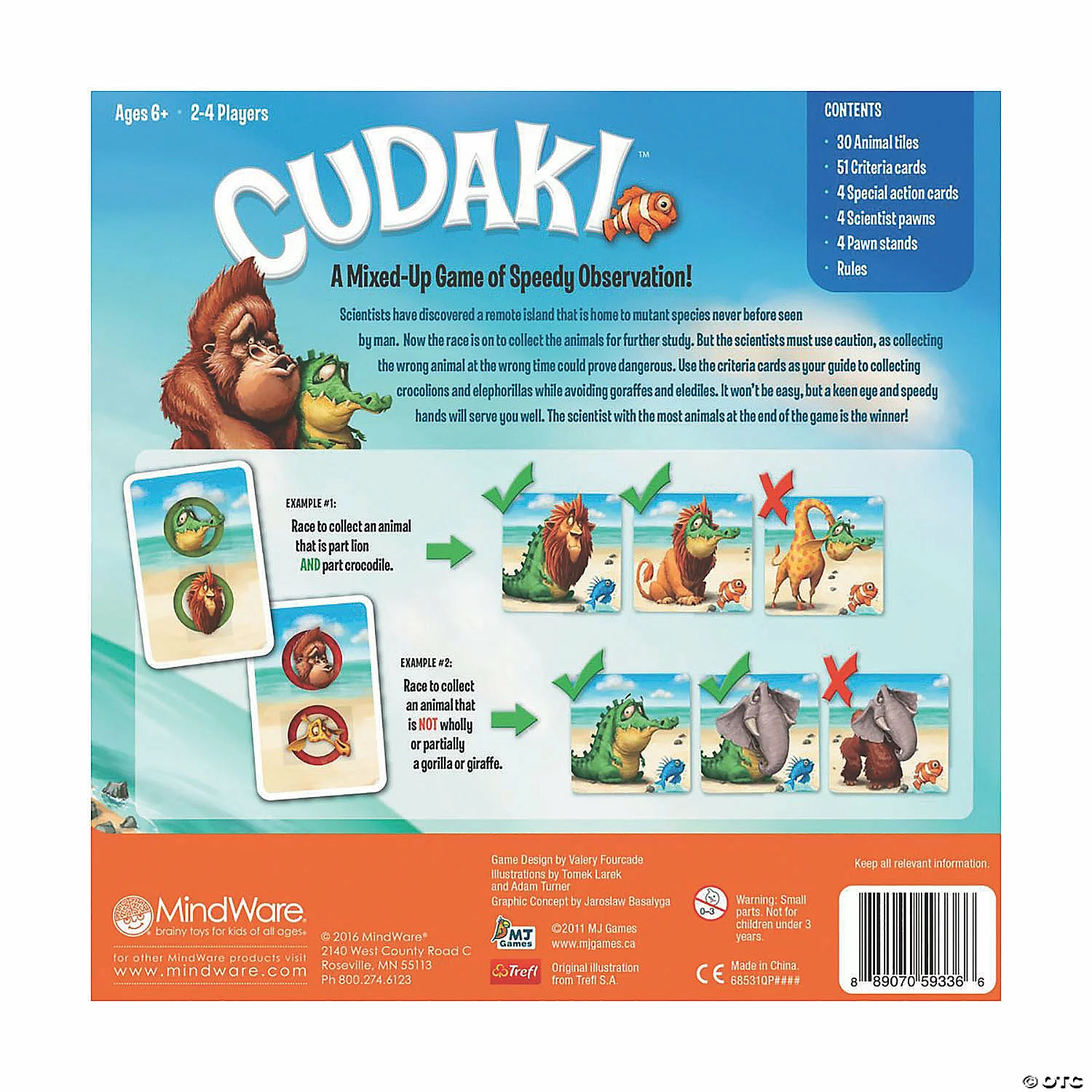 Scientists have discovered mutant species on a remote uncharted island. Now the race is on to collect as many animals as possible for further study. But scientists must use caution, since collecting the wrong animal at the wrong time could prove dangerous. Use the criteria cards to help you decide what animals to keep and which to avoid. A keen eye, speedy hands and mental agility will serve you well! For 2 to 4 players.