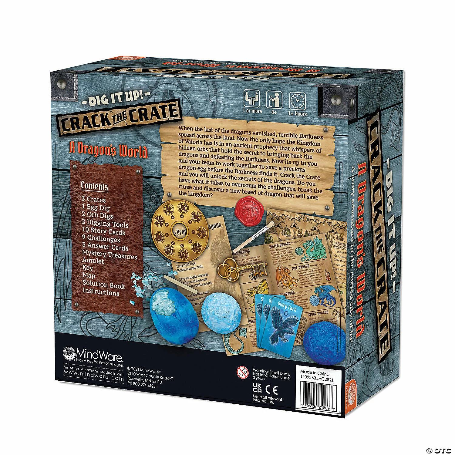 This interactive, one-time-use game lets you merge the excitement of experiential escape rooms and Dig It Up! excavation projects into one exciting group activity! Work together with friends and family to save a precious baby dragon egg and keep darkness from spreading across the land. Do you have what it takes to overcome the series of challenges, unlock the secrets of the dragons and break the curse? • Strengthens creativity, cooperative play and critical thinking• 1 or more players• Unique family game guaranteed to intrigue members of all ages• Includes 3 crates, 1 egg dig, 2 orb digs, 2 digging tools, 10 story cards, 9 challenges, 3 answer cards, mystery treasures, amulet, key, map, solution book and instructionsAge Recommendation: Ages 8 and up