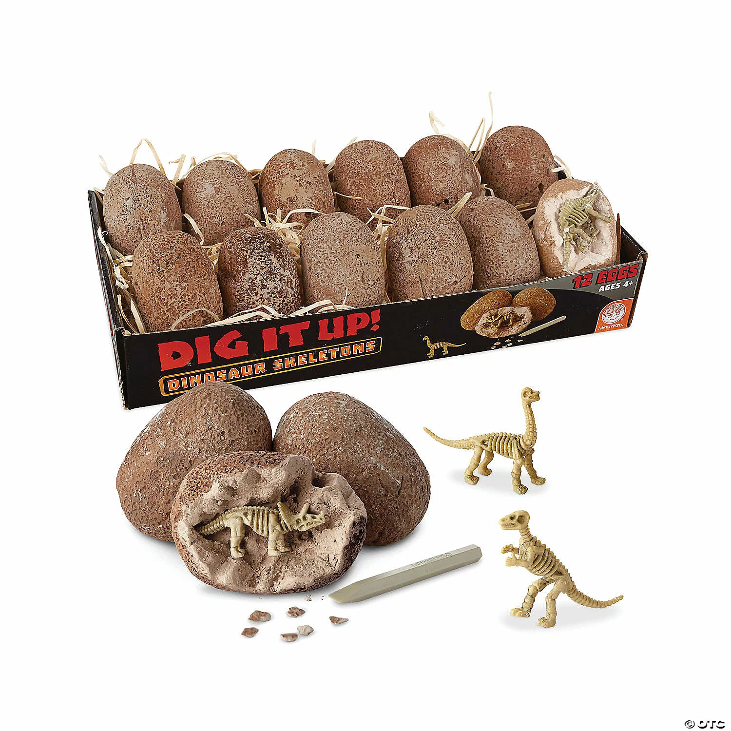 Bring home the mystery and excitement of a paleontological dig! Dig It Up! Discovery packs include 12 individually-wrapped dig projects, each with its own chiseling tool and instructions, making it the perfect excavation kit for a classroom or party! Just soak each 3″ clay egg in water, then chisel away to discover your unique find. Check the included excavation guide for fun facts about your finds, plus extra activities!This kit includes:Excavate dino skeletons with Dig It Up! Dinosaur Skeletons and learn more about each prehistoric reptile!FREE Dig It Up! Excavation Kit: add to the adventure with these tools based on real paleontologist instruments – includes a hammer, chiseling tool, brush, sponge and magnifying lens, plus an excavation mat for quick and easy clean up!• Experience the thrill of discovery with 12 dig-and-discover projects per kit!• Each clay pod contains a different prehistoric dinosaur skeleton toy• A hands-on lesson in science and the natural world for kids• Excavation guide includes exciting information about dinos and activities to do with your dino bones toys• Perfect for a group or party activity!