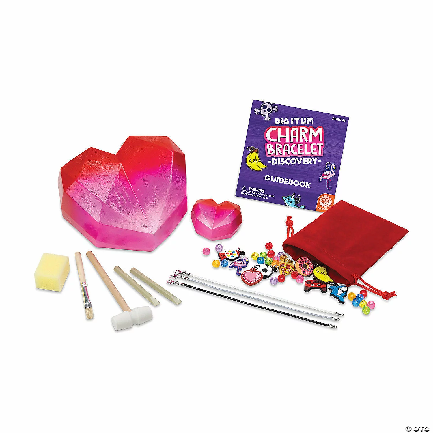 Inside this heart you’ll dig up cute charms, plastic beads and three bracelets: one for you and two for friends. Learn about the history of friendship bracelets, the benefits of having friends and even the significance of bracelet colors in the included guidebook. To get started, soak your dig project in a bowl or sink, chip away with your tools and discover what’s inside. This kit comes with a whole set of excavation tools for hammering, digging and brushing. Friendship bracelets have been beloved for many decades, and now it’s the next generation’s turn to get in on the fun!• Dig It Up! Giant Charm Bracelet Discovery contains 13 soft rubber charms to dig out and add to your friendship bracelets• Hands-on lesson in science that leads to fun with friends• 2 chisels allow you to dig with a friend or sibling• Includes giant heart filled with 12 charms, 2 chiseling tools, 1 hammer, 1 charm cleaning brush, 1 sponge, 3 bracelets, 75 beads, velvet storage bag, bonus heart dig with bonus charm and guidebookAge Recommendation: Ages 4 and up