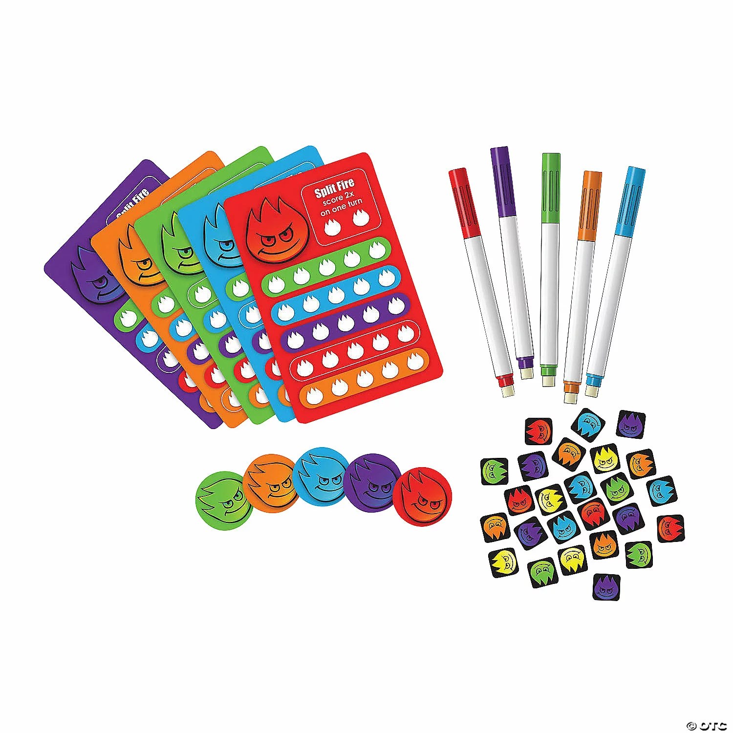 Ignite game night fun with this heated family game of shake and take! With a little luck and some light strategy, you can win by being the first player to check off each color box on your score board. This easy-to-learn dice game is great for firing up friendly competition while boosting counting and color matching skills. Includes 25 identical Feisty Dice, 5 wipe-off score boards, 5 dry erase markers, 5 Free Roll Fireballs and instructions.