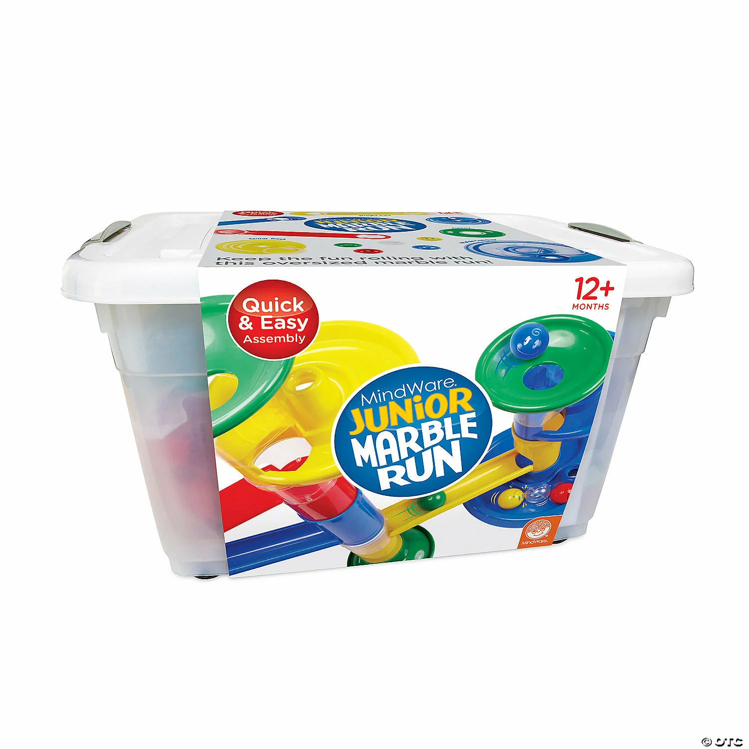 MindWare’s Junior Marble Run lets even the youngest builders in on the fun! Bright, sturdy pieces allow the marbles to roll slowly, building the child’s eye strength and tracking ability, while large, brightly colored marbles use sound, spinning mirrors and fun faces to keep little ones engaged. Step-by-step instructions and simple-to-fit pieces make assembly quick, easy and fun! Marble run pieces are engineered to allow the marble to roll slowly which builds your child’s eye strength, tracking ability and excitement as they watch it travel the course.• Builds eye strength, tracking and motor skills• Includes 14 oversized pieces, 5 giant marbles with fun features & step-by-step instructions• Quick & sturdy assembly