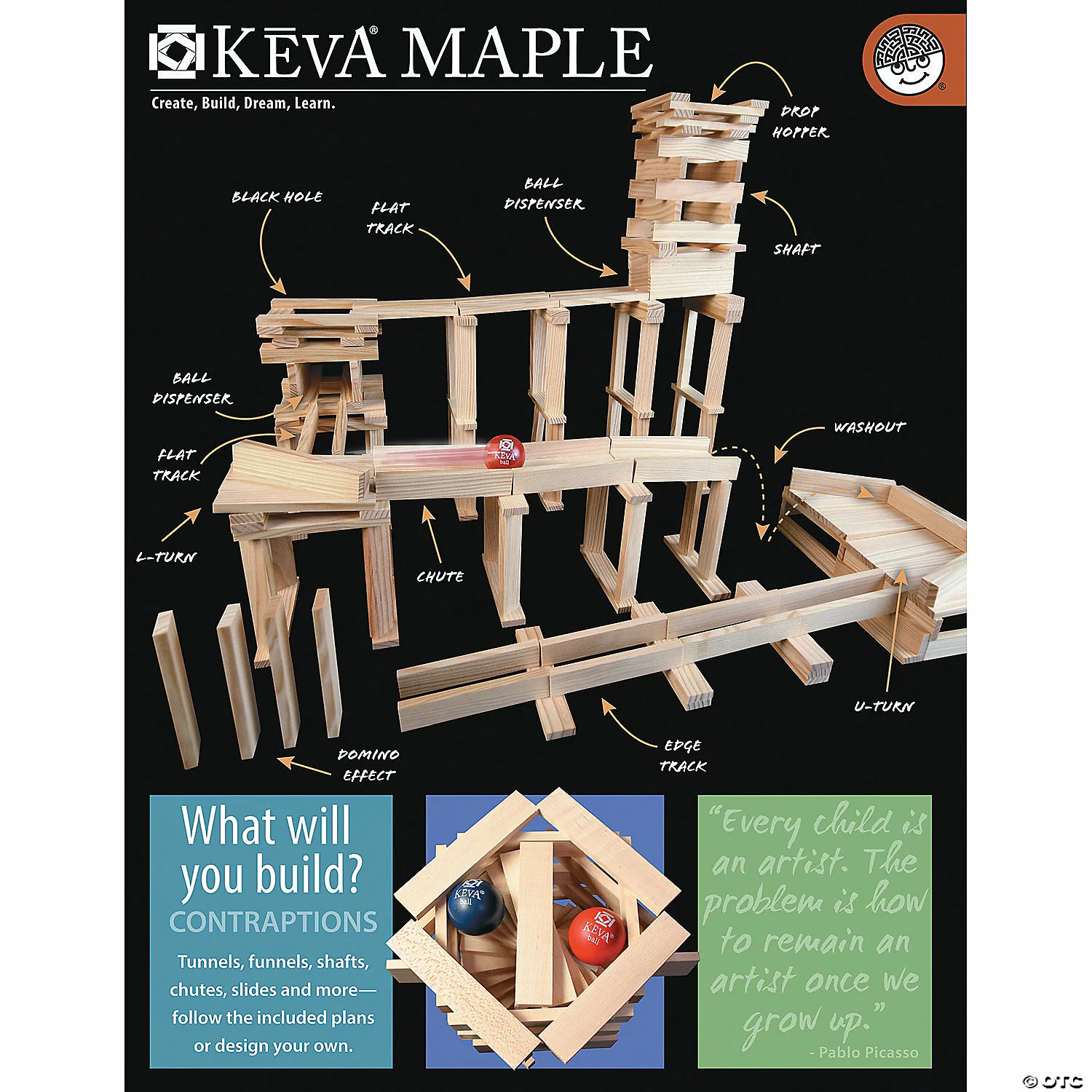 No glue or connectors required…simply stack wood planks to create buildings, monuments and geometric forms. Its the ideal activity to help kids gain an understanding of balance and proportion, as well as an interest in architecture, building and design. A full-color idea booklet with build-out instructions and two lightweight KEVA balls are included. The Benefits of Maple: Premium maple planks are tough, durable and stack perfectly time after time. Beautiful maple wood grain creates works of art. KEVA Maple Planks are proudly made in the U.S.A.