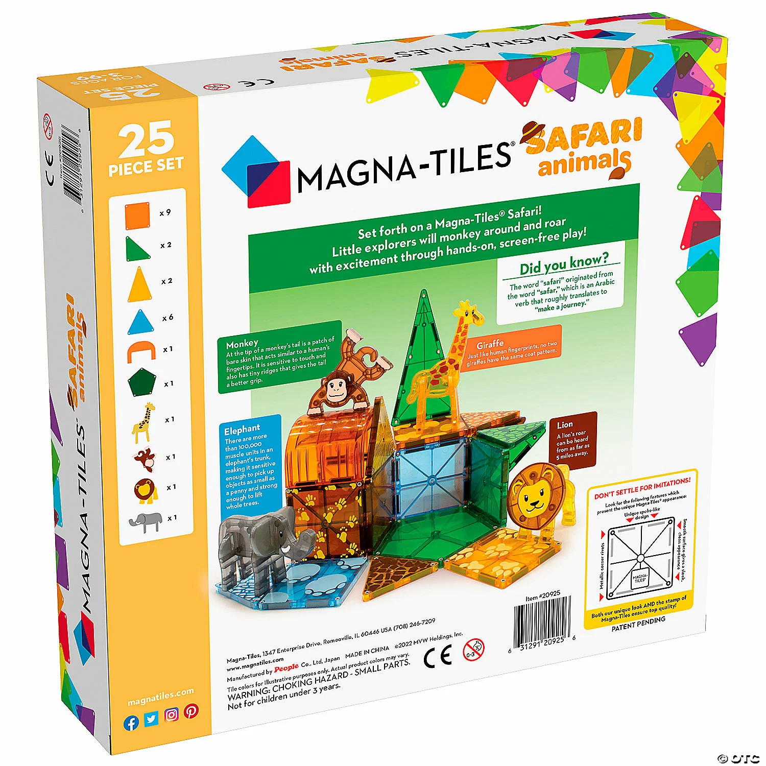 Anything can happen in the wild! Start your expedition with the Safari Animals set for a roaring good time. Monkey around with magnetic, savannah-themed tiles as you explore the vibrant-colored habitat with your four safari sidekicks.• 25 piece set including 4 safari figurines, 9 classic small squares, 2 classic right triangles, 2 cassic isosceles triangles, 6 classic equilateral triangles, 1 arch, 1 pentagon• Four magnetic safari friends enhance the fun: Giraffe, Monkey, Lion, and Elephant• Savannah-themed set with leaf and footprint tiles in realistic colors• Encourages open-ended/unstructured play, storytelling, and creativity