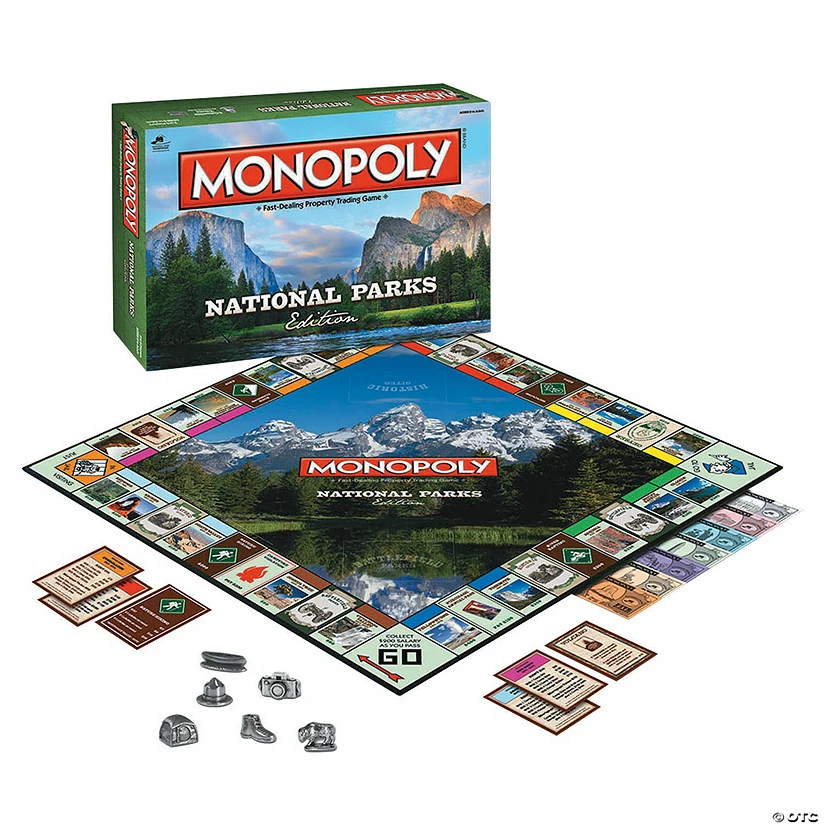 Celebrate the beauty of America’s National Park system with MONOPOLY: National Parks. The game features over 60 of the most beautiful and historic sites in America from the stunning landscape of the Grand Canyon to the awe inspiring wonder of Yellowstone. Also featured in the game are the animals that have captured our hearts and curiosity and call the national parks home. Journey into the heart of America without ever leaving home with MONOPOLY: National Parks Edition. For 2-6 players ages 8 and up.Game includes:• Custom National Parks themed game board featuring 60 National Parks throughout game including Yellowstone (1872), Yosemite (1890), Sequoia (1890), and more. • Educational game matching animals to the parks they inhabit • Custom Money featuring National Monuments: The White House, Thomas Jefferson Memorial, Lincoln Memorial, Washington Monument, Mount Rushmore, Statue of Liberty, Devil’s Tower • 6 Collectible Tokens including Ranger Hat, Tent, Canoe, Bison, Hiking Boot, and CameraSpecial Shipping Information: This item ships separately from other items in your order. This item cannot ship to a P.O. Box. This item may be subject to additional processing days.