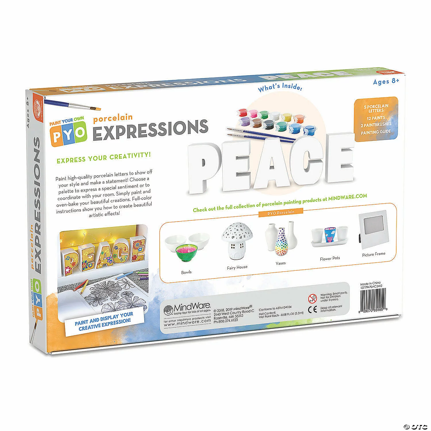 Display a message of kind thoughts and a happy attitude with high-quality porcelain letters you paint with your own creative touch! A beautiful sentiment any time of the year, our “PEACE” set is also a perfect craft for the holidays when painted with images of holly, pine boughs and doves. Each porcelain letter measures 5 inches tall and the complete kit includes 12 paints and 2 brushes – one wide brush for quick coverage and one thin brush for creating details. The instructions are filled with design tips and painting tricks for guaranteed beautiful results. For a more lasting finish, bake the porcelain in the oven as the final step. Note, even after baking, design is not permanent. Dust with a dry cloth to clean.