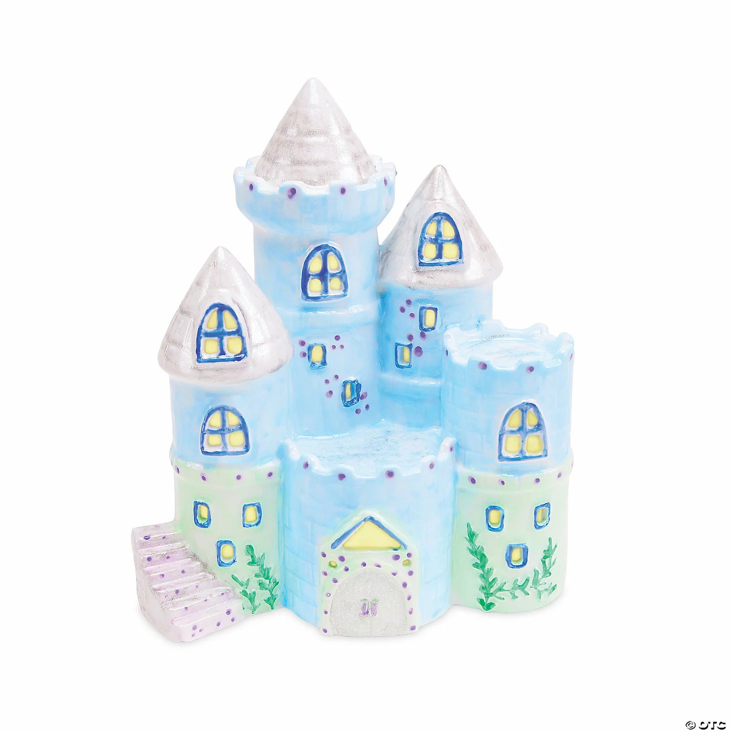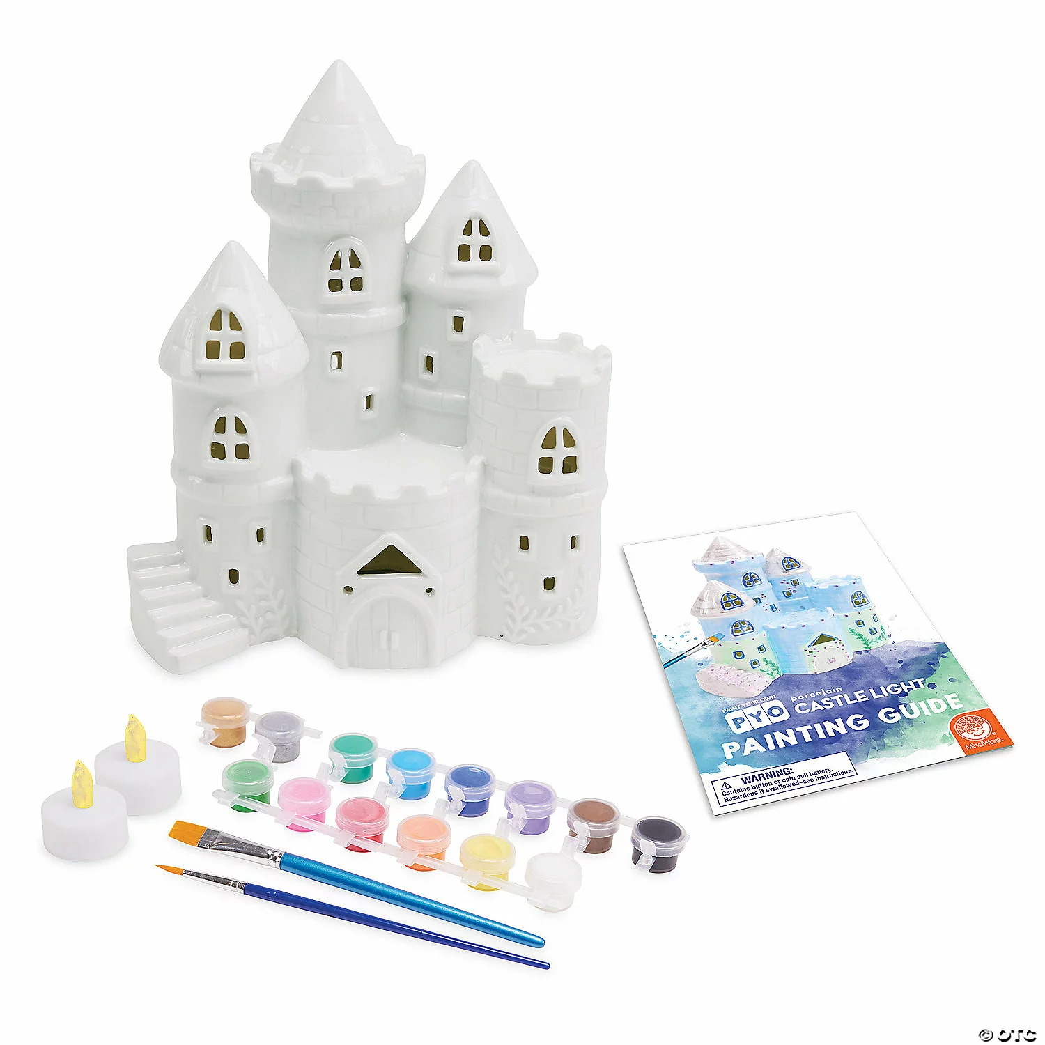 Through the simple craft of painting, you can transform this charming porcelain light into an enchanted castle! Just paint and oven-bake your beautiful castle, and with the click of a button, the included tea lights will cast a magical glow, welcoming peasants and royalty alike. This castle is perfect for illuminating a bedroom nook or other special spot.• Hand paint an enchanted castle accent light. • Promotes creativity, self-expression, imagination and fine motor skills. • Includes a porcelain castle, 2 battery-operated tea lights, 14 paints, 2 paintbrushes and a painting guide.