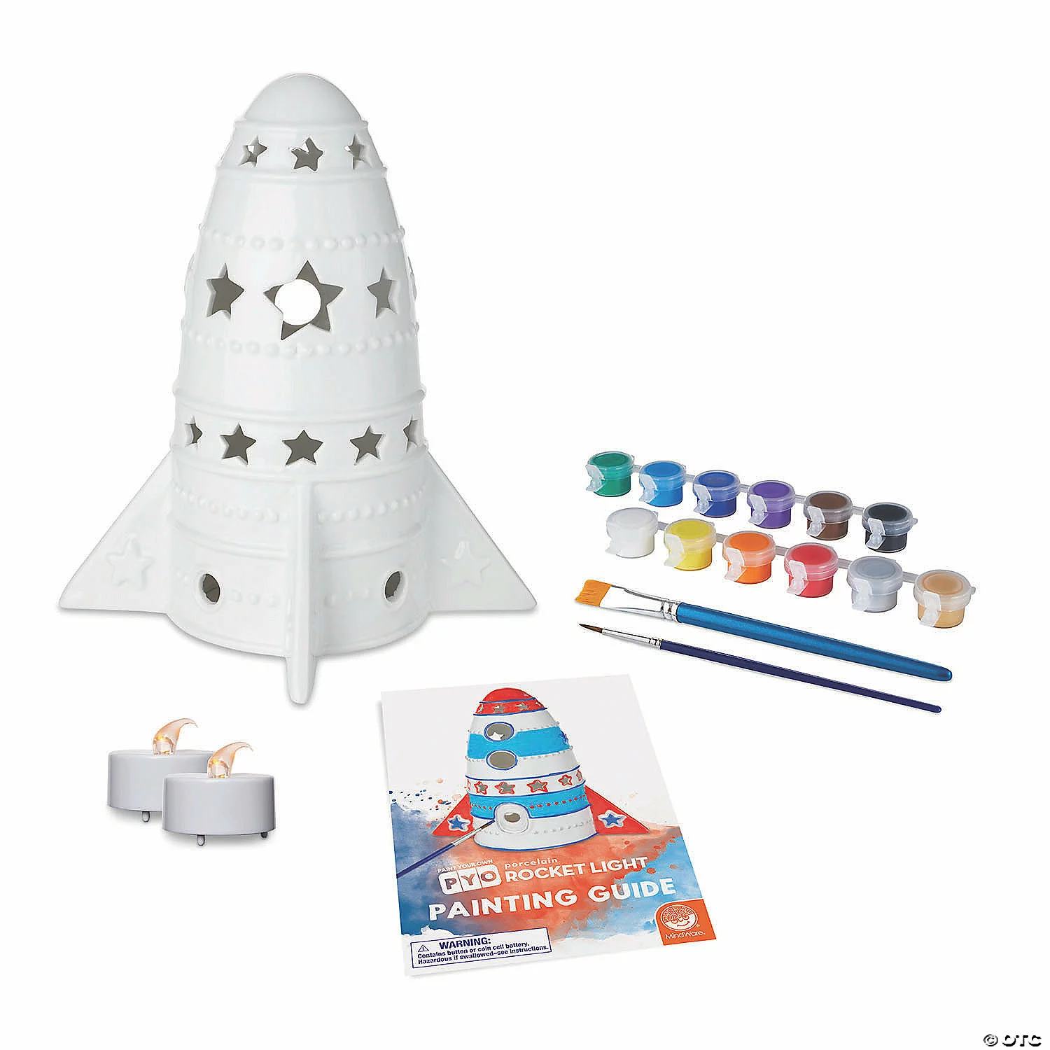 Through the simple craft of painting, budding artists can transform a plain light into a rocket ready to blast off! First, paint and oven-bake your rocket ship. Then with the click of a button, sweet tea lights will cast a moon-like glow as if your ship has banked on a far-off planet for the night. Perfect for a bedroom, nook or other special spot!• Hand paint a porcelain rocket accent light. • Promotes creativity, self-expression, imagination and fine motor skills. • Includes a porcelain rocket ship, 2 battery-operated tea lights, 12 paints, 2 paintbrushes and an instruction guide.
