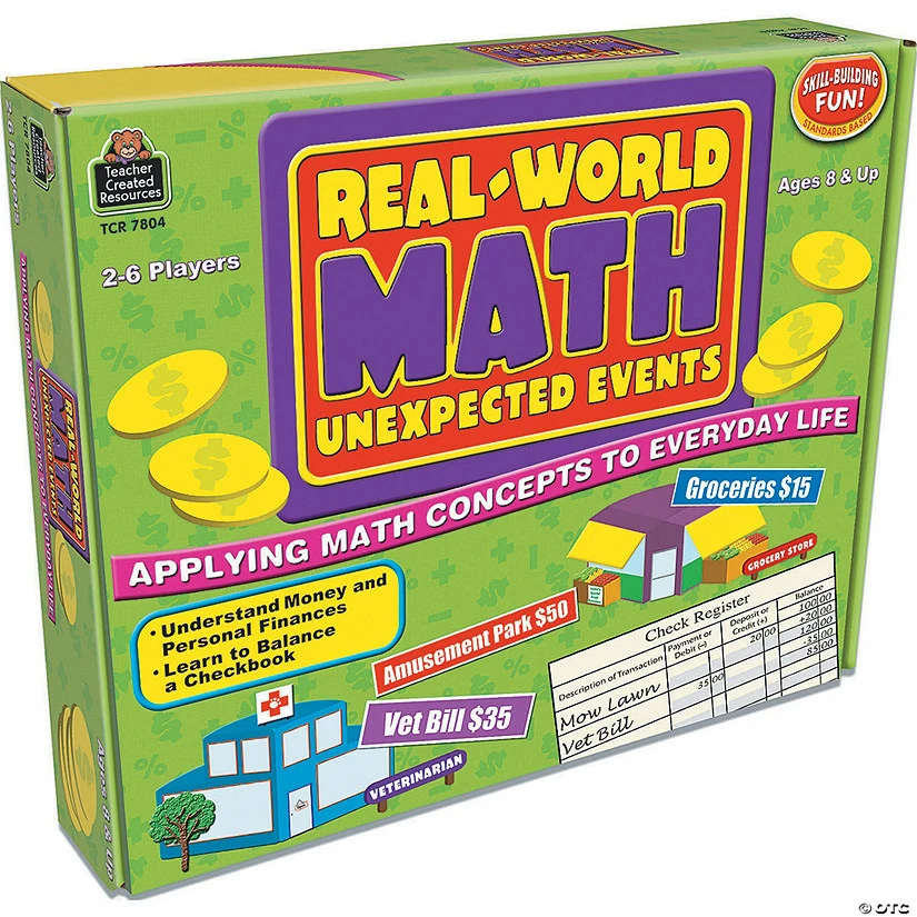 Help students see the relevance of math skills. Each player begins with a checking account balance of $100. In turn, each player sees how many spaces to move and picks up an “unexpected event” card. According to the card’s instructions, the player either adds or subtracts an amount from his or her account (e.g. receiving a birthday gift or taking the cat to the vet). The first player to reach the end receives a bonus amount. Players then add up how much money they have in their accounts; the one with the most money wins. The game board comes with 50 unexpected events cards, 20 sheets of a check register (reproducible), and 6 game pieces. For 2-6 players. Ages 8 & up.