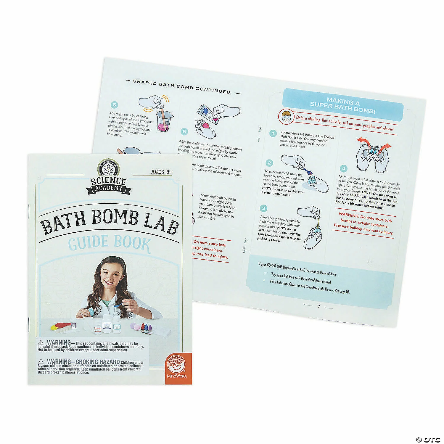 Discover the relaxing side of science with the Science Academy: Bath Bomb Lab kit. By just using a little understanding of chemistry, kids will be able to make cool bath bombs for an aromatic and fizzy bath. This kit offers multiple recipe options to experiment with, giving you options for different sizes, colors and scents, and even the ability to create a super bath bomb for ultimate fizzy fun. This kit makes learning about unique chemical reactions occurring within the creation and use bath bombs easy, safe and exciting. If you’re looking for an educational lesson in chemistry that also creates a lush after-product, this bath bomb lab is exactly what you want to soak up. Comes with: sodium bicarbonate, citric acid, cornstarch, glycerin, two measuring beakers, bath bomb molds, two pairs of latex free laboratory gloves, goggles, spoon, two bottles of liquid coloring, vanilla fragrance, three stirring sticks, bamboo stick, two balloons, balloon ties and pipette.• Learn about the unique chemistry needed to create a bath bomb• Experiment with different sizes, shapes, colors and scents• Fun, safe and non-toxic hands-on lab• Teaches: a love for chemistry, an interest in general sciences, critical thinking skillsDownload Guidebook