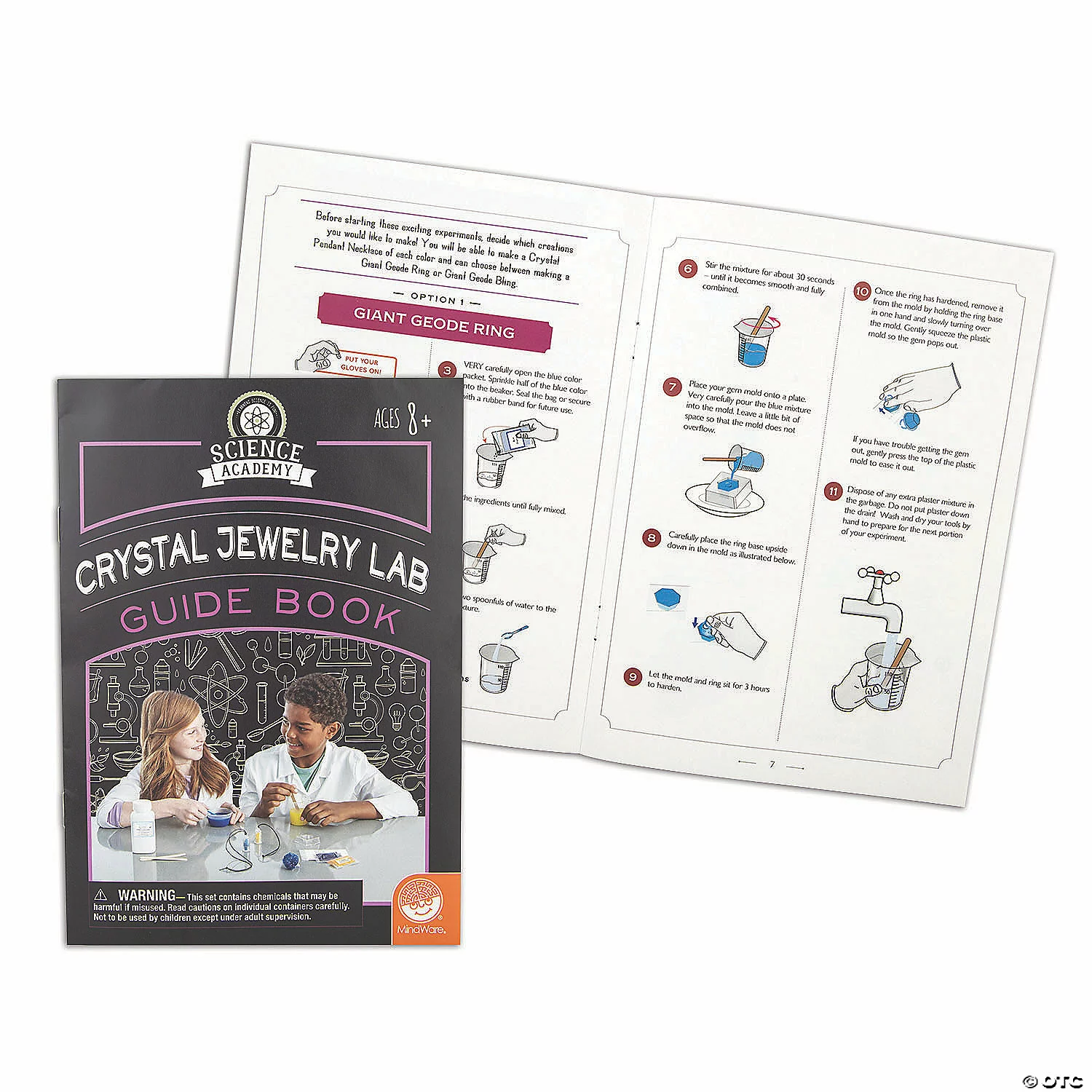 Do you have a curious kid who loves everything that sparkles? Some science experiments for kids shine brighter than the rest! Grow stunning geodes through the amazing process of crystallization with this brilliant lab activity. The kit includes all the science supplies needed, along with crystal clear, step-by-step instructions for dazzling gems worthy to be worn. Includes a ring and 2 pendant necklaces to display custom jewelry creations.• Create your own geode gem jewelry• A hands-on lesson in science for kids• Learn about the formation and growth of crystals• Includes a full-color instruction manual and supplies• Safety gloves are latex free