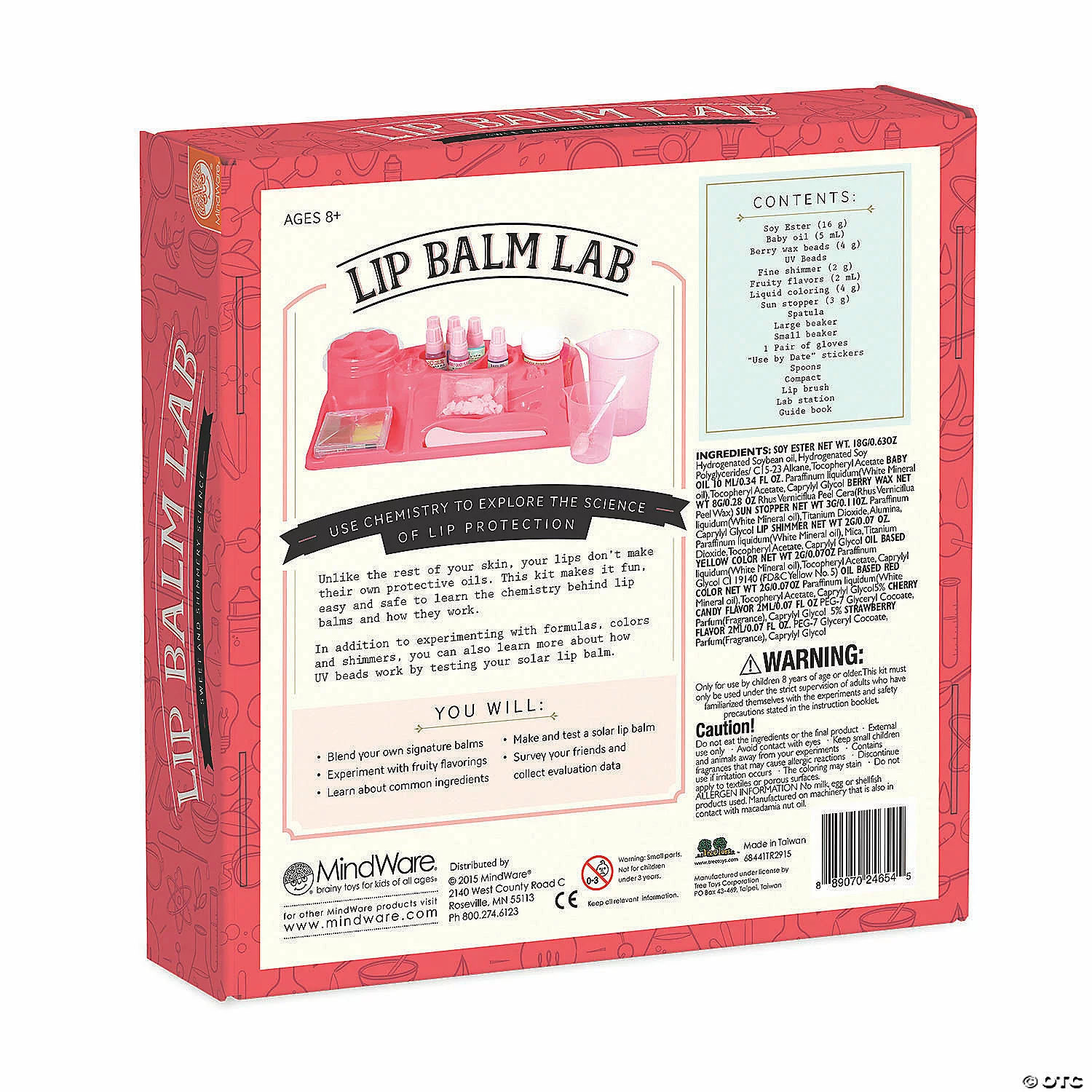 Discover the sweet and shimmery science behind lip balm! Lip Balm keeps your lips smooth and shiny, but did you ever wonder how it’s made and what makes it work? With the Science Academy’s Lip Balm Lab you will blend your own signature balms, experiment with fruity flavorings and learn about common ingredients! Contents include: lab station, baby oil, berry wax beads, fine shimmer, fruity flavors, sun stopper, compact, spoons, beakers and much more! The detailed guide booklet includes step-by-step instructions, storage advice, product testing and ingredient info. Once you’ve created your delightful formulations, use the evaluation data sheet to form focus groups with friends and family and rank the popularity of each! Think like a real scientist while creating a luxurious custom item you can use over and over. • Promotes an interest in chemistry and helps develop critical thinking skills • Hands-on science kit that is fun, safe, non-toxic and gluten free• Custom lip balm recipes and experiments include: basic, solar blocker, luxury and shimmer • 20 pieces in all• Allergy information: does not contain milk, egg or shellfish products. Manufactured on machinery that is also in contact with macadamia nut oil.