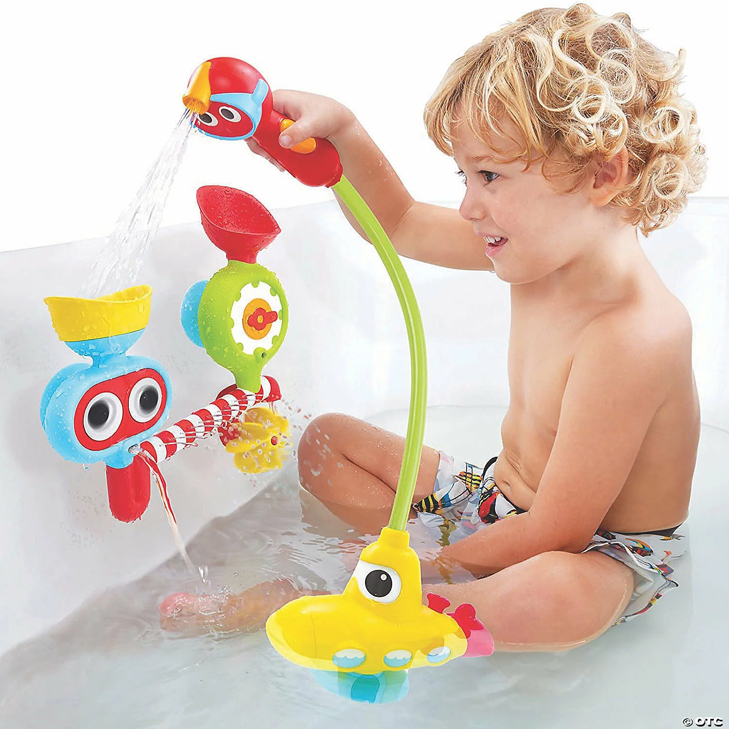 An adorable submarine draws water from the tub and allows for safe spraying fun! Water magically streams through a shower head specifically designed for activation by small hands. This truly takes bath time fun up a notch, as your child experiments with directing water flow through the activity center to generate a chain reaction of magical water effects. Fix the spray station to your tub or let it float during bathtime, and the battery operated system circulates water safely without wasting it from the tap. Make bathtime a time for learning, too – play will teach little ones cause and effect, boost motor skills, and stimulate their senses for an immersive experience. Includes a battery-operated submarine with water circulation pumping system.