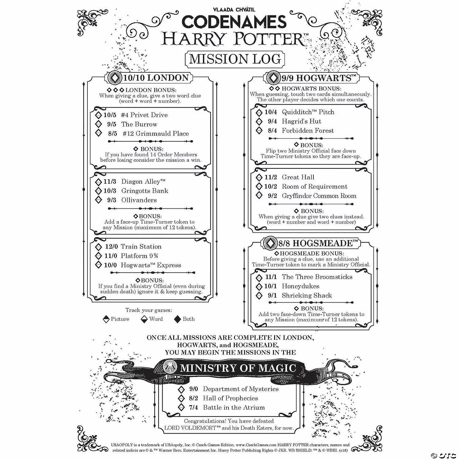 CODENAMES: Harry Potter is a fun, easy-to-learn cooperative word and picture deduction game for Harry Potter fans of all game levels. Players help their teammates locate secret Agents who are concealed among a grid of Harry Potter references. Use only one-word clues to guide guessers to the right spots, or hidden Death Eaters will cost them the win. This co-op game is a great challenge for Harry Potter fans of all levels. Work together with multiple players on each team to increase your chances of locating all of the secret Agents. For 2 or more players, ages 11 and up. Contents include: 200 code cards, 100 double-sided Key cards, 15 Order of the Phoenix cards, 1 Death Eater cover card, 12 Time-Turner tokens, 1 pad of Mission Logs, 1 card stand, and Instructions.Ā Ā Special Shipping Information:Ā This item ships separately from other items in your order.Ā This item cannot ship to a P.O. Box.Ā This item may be subject to additional processing days.Ā Ā Item is not eligible for expedited shipping.Ā Ā Ā Ā You may initiate a return for unused items within 30 days, if the items are in original packaging with all original materials included with the shipment.